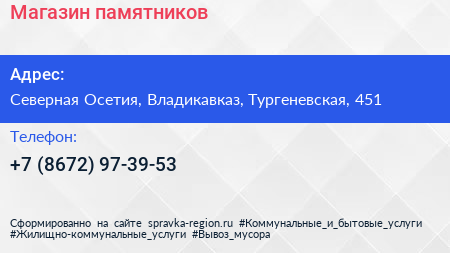 Магазин памятников по адресу Северная Осетия, Владикавказ, Тургеневская, 451 в дальнейшем Организация, размещена в следующих категориях: