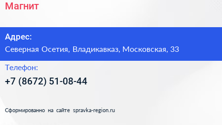 Магнит по адресу Северная Осетия, Владикавказ, Московская, 33 в дальнейшем Организация, размещена в следующих категориях:
