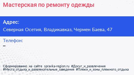 Мастерская по ремонту одежды по адресу Северная Осетия, Владикавказ, Чермен Баева, 47 в дальнейшем Организация, размещена в следующих категориях: