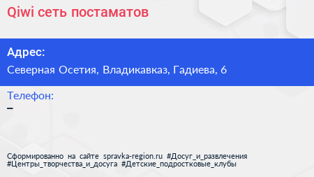Qiwi, сеть постаматов по адресу Северная Осетия, Владикавказ, Гадиева, 6 в дальнейшем Организация, размещена в следующих категориях: