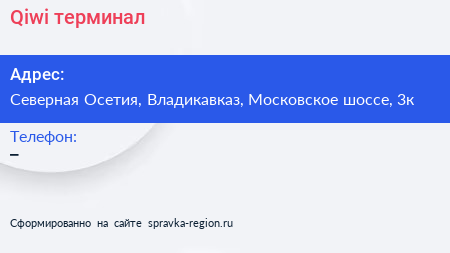 Qiwi, терминал по адресу Северная Осетия, Владикавказ, Московское шоссе, 3к в дальнейшем Организация, размещена в следующих категориях: