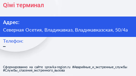 Qiwi, терминал по адресу Северная Осетия, Владикавказ, Владикавказская, 50/4а в дальнейшем Организация, размещена в следующих категориях: