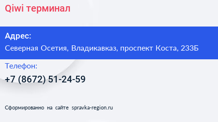 Qiwi, терминал по адресу Северная Осетия, Владикавказ, проспект Коста, 233Б в дальнейшем Организация, размещена в следующих категориях: