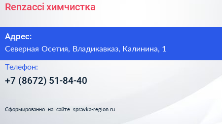 Renzacci, химчистка по адресу Северная Осетия, Владикавказ, Калинина, 1 в дальнейшем Организация, размещена в следующих категориях: