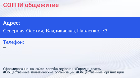 СОГПИ, общежитие по адресу Северная Осетия, Владикавказ, Павленко, 73 в дальнейшем Организация, размещена в следующих категориях: