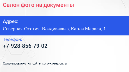 Салон фото на документы по адресу Северная Осетия, Владикавказ, Карла Маркса, 1 в дальнейшем Организация, размещена в следующих категориях: