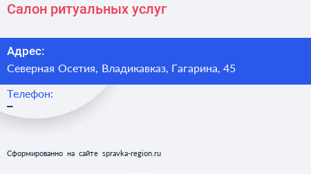 Салон ритуальных услуг по адресу Северная Осетия, Владикавказ, Гагарина, 45 в дальнейшем Организация, размещена в следующих категориях: