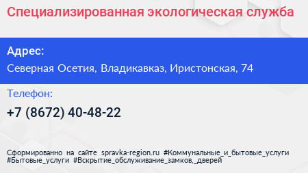 Специализированная экологическая служба по адресу Северная Осетия, Владикавказ, Иристонская, 74 в дальнейшем Организация, размещена в следующих категориях:
