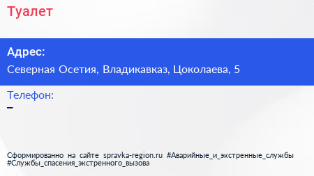 Туалет по адресу Северная Осетия, Владикавказ, Цоколаева, 5 в дальнейшем Организация, размещена в следующих категориях: