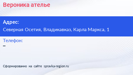Вероника, ателье по адресу Северная Осетия, Владикавказ, Карла Маркса, 1 в дальнейшем Организация, размещена в следующих категориях: