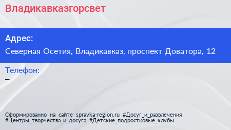 Владикавказгорсвет по адресу Северная Осетия, Владикавказ, проспект Доватора, 12 в дальнейшем Организация, размещена в следующих категориях: