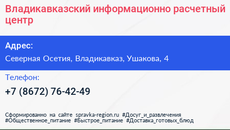 Владикавказский информационно-расчетный центр по адресу Северная Осетия, Владикавказ, Ушакова, 4 в дальнейшем Организация, размещена в следующих категориях: