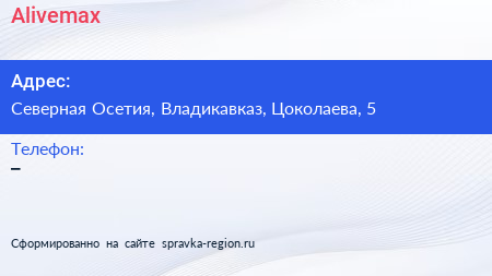 Alivemax по адресу Северная Осетия, Владикавказ, Цоколаева, 5 в дальнейшем Организация, размещена в следующих категориях: