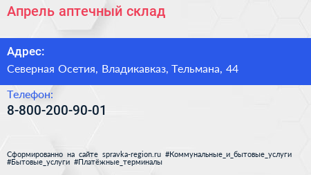 Апрель, аптечный склад по адресу Северная Осетия, Владикавказ, Тельмана, 44 в дальнейшем Организация, размещена в следующих категориях: