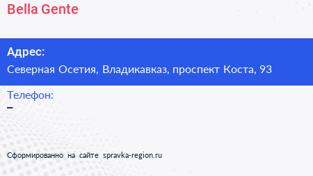 Bella Gente по адресу Северная Осетия, Владикавказ, проспект Коста, 93 в дальнейшем Организация, размещена в следующих категориях: