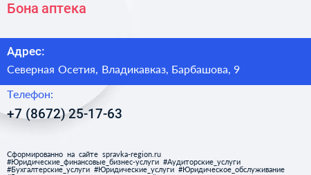 Бона, аптека по адресу Северная Осетия, Владикавказ, Барбашова, 9 в дальнейшем Организация, размещена в следующих категориях: