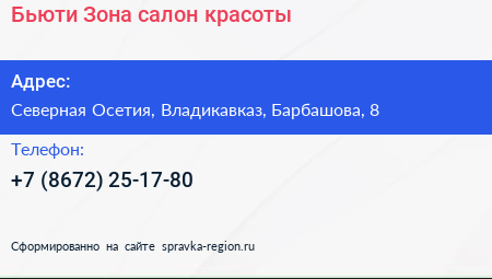 Бьюти Зона, салон красоты по адресу Северная Осетия, Владикавказ, Барбашова, 8 в дальнейшем Организация, размещена в следующих категориях: