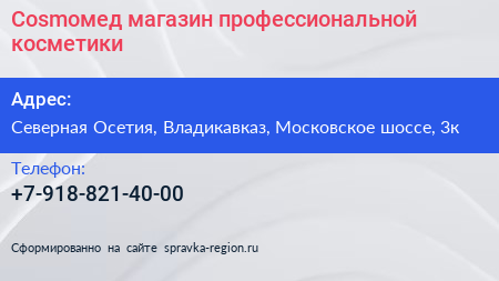 Cosmoмед, магазин профессиональной косметики по адресу Северная Осетия, Владикавказ, Московское шоссе, 3к в дальнейшем Организация, размещена в следующих категориях: