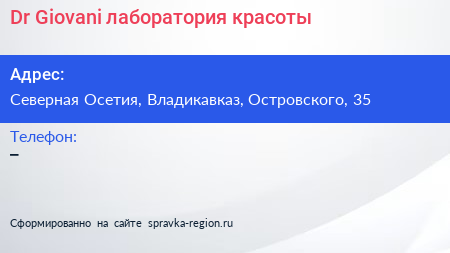 Dr. Giovani, лаборатория красоты по адресу Северная Осетия, Владикавказ, Островского, 35 в дальнейшем Организация, размещена в следующих категориях:
