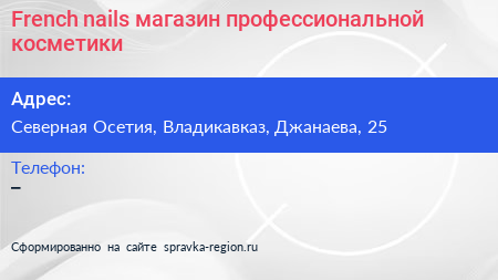 French nails, магазин профессиональной косметики по адресу Северная Осетия, Владикавказ, Джанаева, 25 в дальнейшем Организация, размещена в следующих категориях: