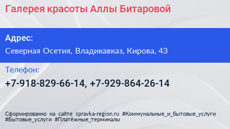 Галерея красоты Аллы Битаровой по адресу Северная Осетия, Владикавказ, Кирова, 43 в дальнейшем Организация, размещена в следующих категориях: