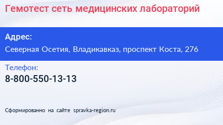 Гемотест, сеть медицинских лабораторий по адресу Северная Осетия, Владикавказ, проспект Коста, 276 в дальнейшем Организация, размещена в следующих категориях: