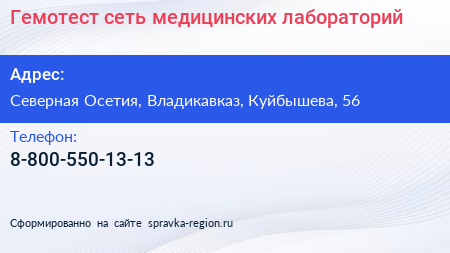 Гемотест, сеть медицинских лабораторий по адресу Северная Осетия, Владикавказ, Куйбышева, 56 в дальнейшем Организация, размещена в следующих категориях:
