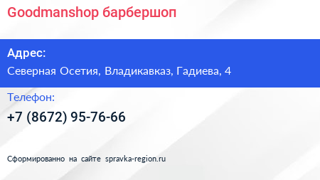 Goodmanshop, барбершоп по адресу Северная Осетия, Владикавказ, Гадиева, 4 в дальнейшем Организация, размещена в следующих категориях: