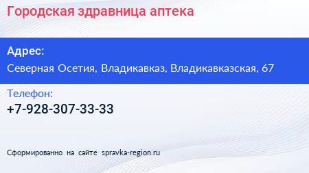 Городская здравница, аптека по адресу Северная Осетия, Владикавказ, Владикавказская, 67 в дальнейшем Организация, размещена в следующих категориях: