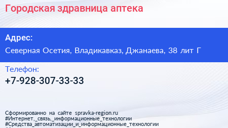 Городская здравница, аптека по адресу Северная Осетия, Владикавказ, Джанаева, 38 лит Г в дальнейшем Организация, размещена в следующих категориях: