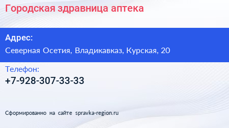 Городская здравница, аптека по адресу Северная Осетия, Владикавказ, Курская, 20 в дальнейшем Организация, размещена в следующих категориях: