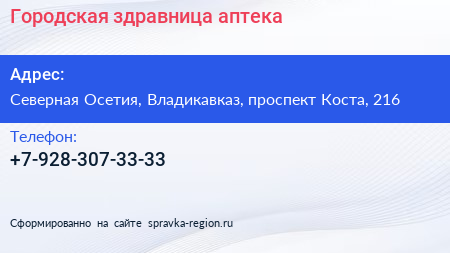 Городская здравница, аптека по адресу Северная Осетия, Владикавказ, проспект Коста, 216 в дальнейшем Организация, размещена в следующих категориях: