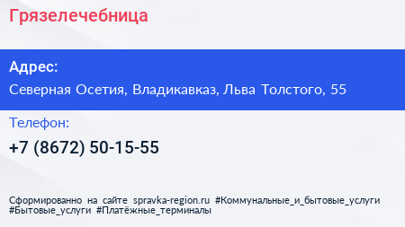 Грязелечебница по адресу Северная Осетия, Владикавказ, Льва Толстого, 55 в дальнейшем Организация, размещена в следующих категориях:
