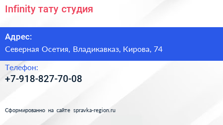 Infinity, тату-студия по адресу Северная Осетия, Владикавказ, Кирова, 74 в дальнейшем Организация, размещена в следующих категориях: