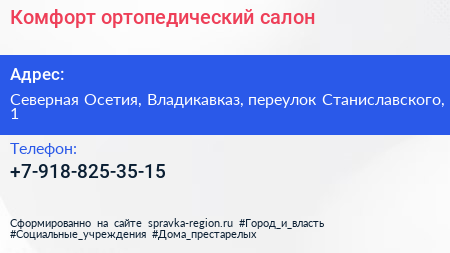 Комфорт, ортопедический салон по адресу Северная Осетия, Владикавказ, переулок Станиславского, 1 в дальнейшем Организация, размещена в следующих категориях: