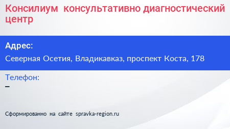 Консилиум+, консультативно-диагностический центр по адресу Северная Осетия, Владикавказ, проспект Коста, 178 в дальнейшем Организация, размещена в следующих категориях: