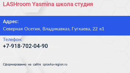 LASHroom Yasmina, школа-студия по адресу Северная Осетия, Владикавказ, Гугкаева, 22 к1 в дальнейшем Организация, размещена в следующих категориях: