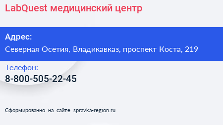 LabQuest, медицинский центр по адресу Северная Осетия, Владикавказ, проспект Коста, 219 в дальнейшем Организация, размещена в следующих категориях: