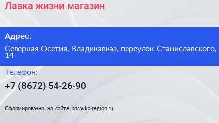 Лавка жизни, магазин по адресу Северная Осетия, Владикавказ, переулок Станиславского, 14 в дальнейшем Организация, размещена в следующих категориях:
