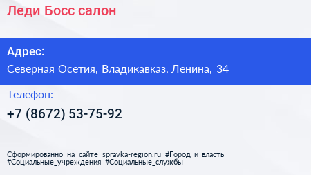 Леди Босс, салон по адресу Северная Осетия, Владикавказ, Ленина, 34 в дальнейшем Организация, размещена в следующих категориях: