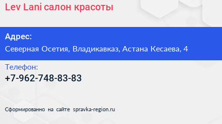 Lev-Lani, салон красоты по адресу Северная Осетия, Владикавказ, Астана Кесаева, 4 в дальнейшем Организация, размещена в следующих категориях: