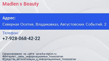 Madlen`s Beauty по адресу Северная Осетия, Владикавказ, Августовских Событий, 2 в дальнейшем Организация, размещена в следующих категориях: