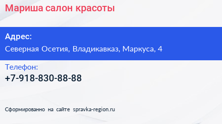 Мариша, салон красоты по адресу Северная Осетия, Владикавказ, Маркуса, 4 в дальнейшем Организация, размещена в следующих категориях:
