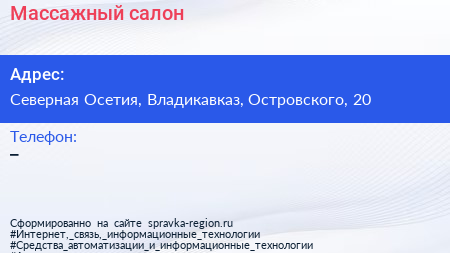 Массажный салон по адресу Северная Осетия, Владикавказ, Островского, 20 в дальнейшем Организация, размещена в следующих категориях: