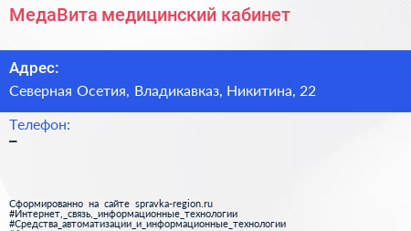 МедаВита, медицинский кабинет по адресу Северная Осетия, Владикавказ, Никитина, 22 в дальнейшем Организация, размещена в следующих категориях: