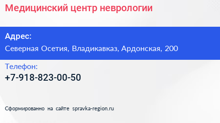Медицинский центр неврологии по адресу Северная Осетия, Владикавказ, Ардонская, 200 в дальнейшем Организация, размещена в следующих категориях: