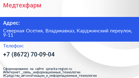 Медтехфарм по адресу Северная Осетия, Владикавказ, Карджинский переулок, 9-11 в дальнейшем Организация, размещена в следующих категориях: