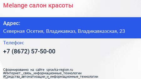 Melange, салон красоты по адресу Северная Осетия, Владикавказ, Владикавказская, 23 в дальнейшем Организация, размещена в следующих категориях: