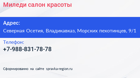 Миледи, салон красоты по адресу Северная Осетия, Владикавказ, Морских пехотинцев, 9/1 в дальнейшем Организация, размещена в следующих категориях: