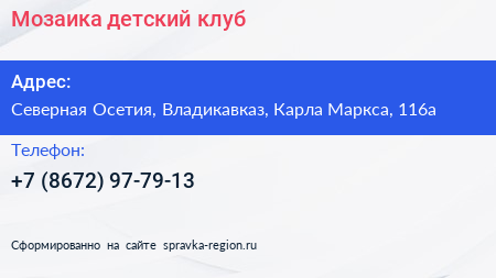 Мозаика, детский клуб по адресу Северная Осетия, Владикавказ, Карла Маркса, 116а в дальнейшем Организация, размещена в следующих категориях: